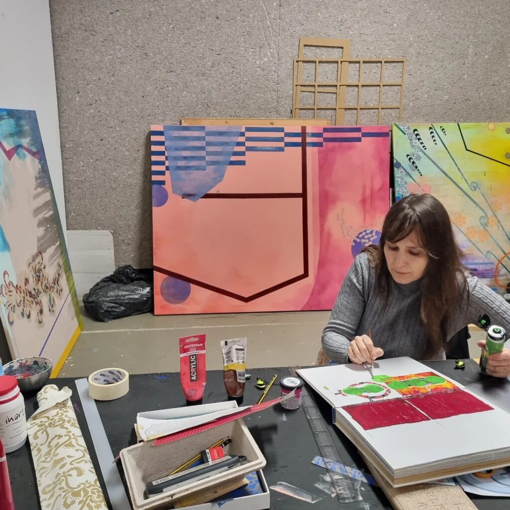 exigente, feito de pesquisa, experimentação e perseverança, mas também de momentos de descoberta e satisfação. Daqui a cinco anos, espero continuar a ter a força, a energia e a motivação necessárias para seguir por este percurso, aprofundando a minha linguagem plástica e explorando novas possibilidades técnicas e conceptuais – neste sentido não faço ideia o que será a inha pintura daqui a 5 anos, mas estou curiosa – que caminhos irei tomar. Gostaria de consolidar vínculos com uma galeria privada na Península Ibérica que me permita apresentar, de forma regular, exposições individuais, bem como manter a participação em projetos coletivos desafiantes. Vejo-me também a continuar a escrever e a refletir sobre pintura e arte contemporânea (comecei este ano e estou a gostar muito desta