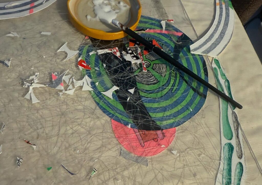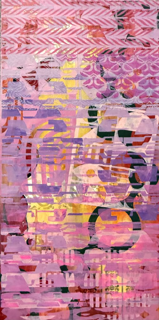 Vera Fonseka – Costumo começar pela preparação dos elementos visuais, escala, seleção cromática e códigos que vão compor cada peça — fragmentos de colagem, desenhos, carimbos, elementos de serigrafia, gestos ou camadas de acrílico. Depois escrevo, faço pequenos esboços no papel ou no Procreate, embora curiosamente nunca tenha o hábito de os guardar. Talvez porque o processo se revele mais no fazer do que no planear. Testar combinações é importante, mas muitas vezes o percurso é mesmo processual — começa por experimentação e vai-se revelando no próprio gesto. Raramente trabalho numa só peça; gosto de ter vários trabalhos em simultâneo, o que me permite circular entre