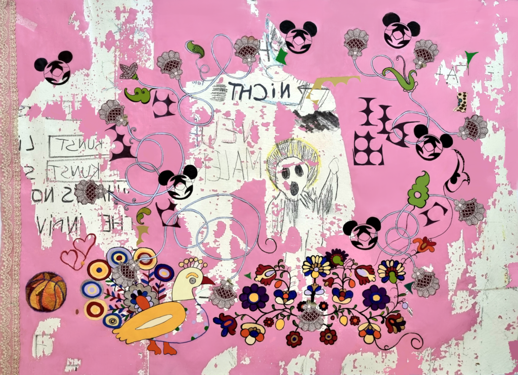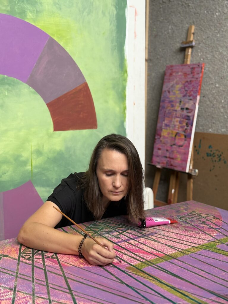 comecei a desenvolver um projeto em conjunto com outra artista. Estamos a preparar a nossa exposição que irá inaugurar a 12 de Dezembro no MU.SA, e tem sido uma experiência nova e estimulante. No passado, experimentei fazer graffiti em dupla — gostei do processo, mas acabei por seguir caminho na pintura em tela, que é onde me sinto mais enraizada. Quanto à interdisciplinaridade, também está a emergir agora de forma mais consciente. Este ano comecei a integrar tecidos e serigrafia nas minhas obras, e estou a planear juntar madeira em peças que espero concluir até setembro. Ainda estou numa fase de exploração, mas sinto que estas cruzas entre técnicas e materiais abrem novas possibilidades, sem perder o foco na pintura como eixo central.