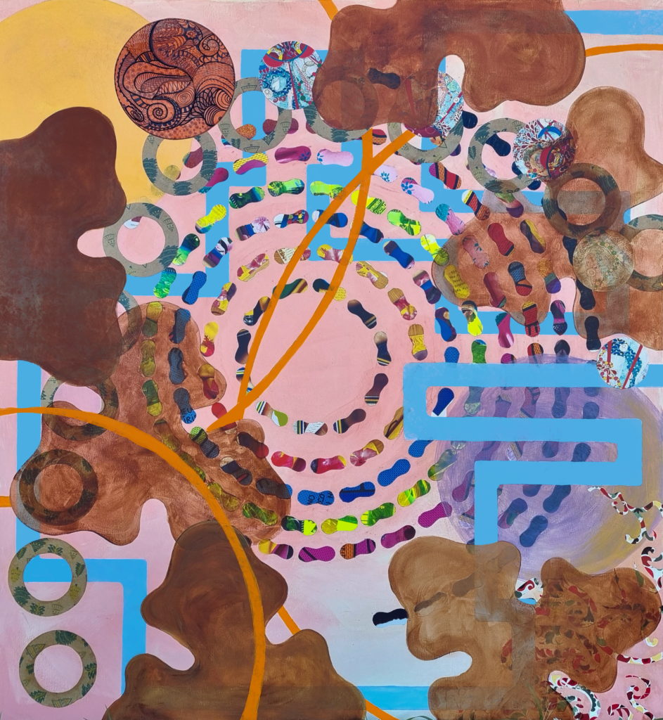 corpo com sentido. A pintura, tal como a colagem, oferece-me um espaço para procurar unidade — como uma construção em movimento, feita de camadas, repetições e revisitações das experiências pessoais e momentos históricos do tema que trabalho. O que procuro transmitir é a ideia de que é possível reorganizar (reinscrever) o que nos marca — memórias, relações, sentimento de pertença ou de não pertença — e, com isso, criar um lugar interno, subjetivo, onde habitar. Trata-se de um exercício de reconciliação: entre tempos, entre identidades, entre aquilo que herdamos e aquilo que escolhemos para