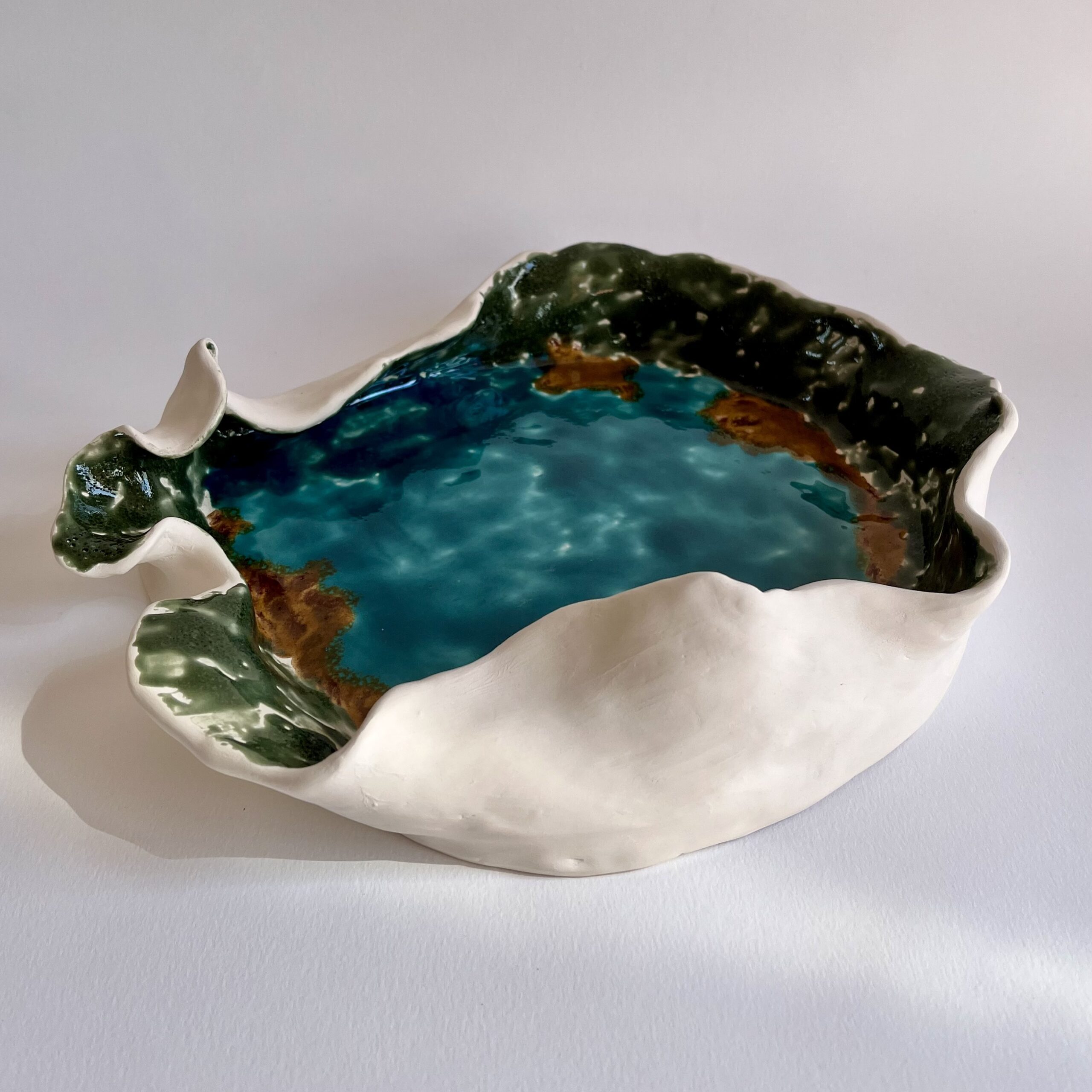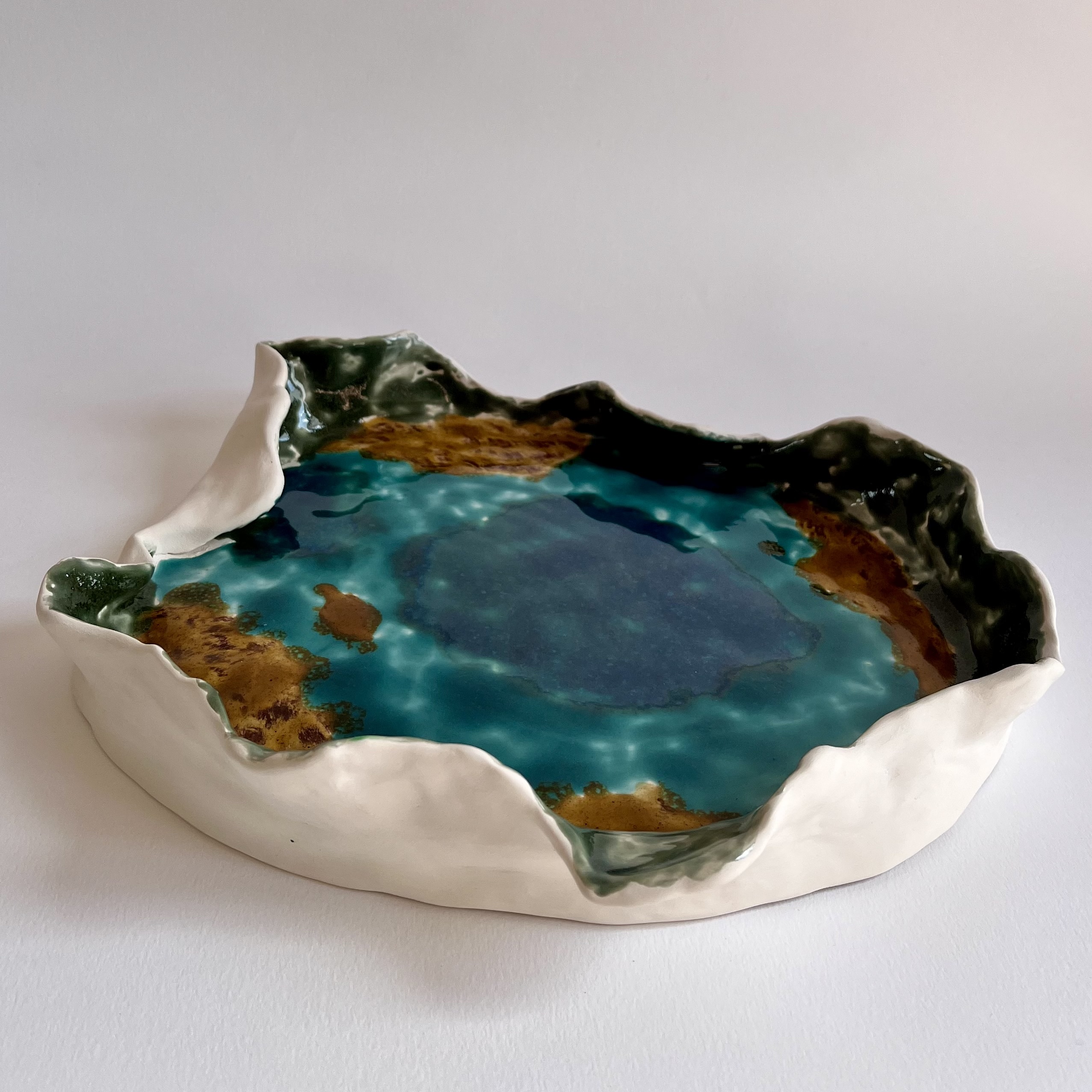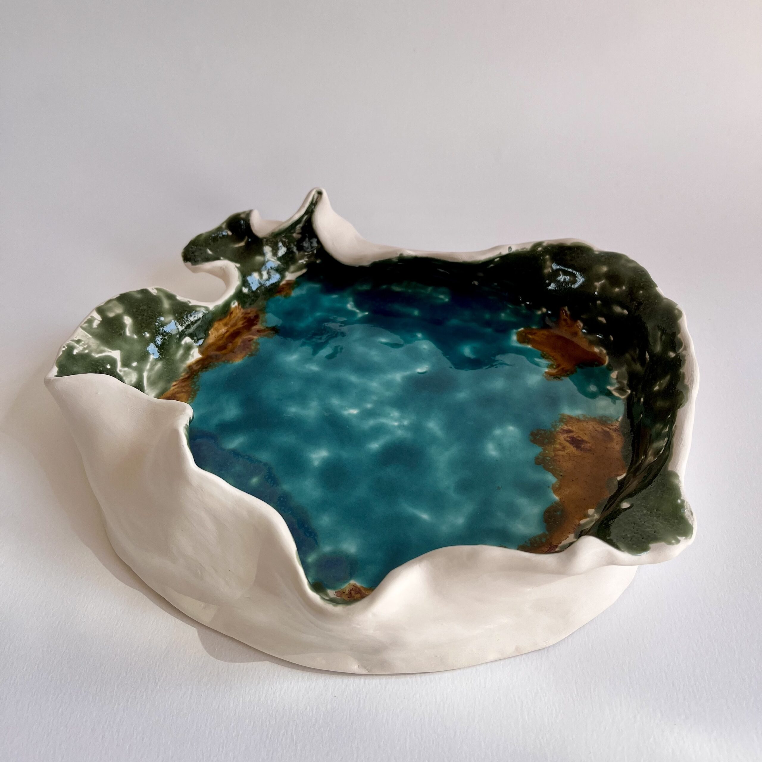 Laura Vitorino Rebelo (Funchal, 1985) vive e trabalha no Alentejo, Portugal. Laura é uma artista multidisciplinar cuja prática está profundamente enraizada na paisagem, no território e na experimentação material. É licenciada em Artes Visuais e mestre em Práticas Artísticas em Artes Visuais pela Universidade de Évora, sendo atualmente investigadora de doutoramento em História da Arte no Centro de História da Arte e Investigação Artística. Em 2019 e 2023, foi selecionada para integrar a publicação Portuguese Emerging Art, destacando a sua posição no panorama da prática artística contemporânea portuguesa. A sua prática desenvolve-se a partir da paisagem, do território e da experimentação material, através de processos lentos de observação e de fazer. Trabalhando com cerâmica, fotografia e vídeo, explora a paisagem enquanto experiência vivida e sensorial, moldada pela memória, pelo tempo e pelo lugar. If the Earth Wasn’t Round é uma coleção de peças cerâmicas em faiança, moldadas manualmente, sendo cada uma única. Inspiradas nas barragens do Alentejo, as obras traduzem as variações cromáticas e formais resultantes do encontro entre a água e a terra. O processo é intuitivo e aberto ao acaso, respeitando o comportamento natural do barro. Os óxidos naturais são aplicados manualmente, de forma pictórica, evocando os tons da terra e da água. Estas peças surgem como paisagens cerâmicas abstratas, expressando quietude, transformação e impermanência. Através de um saber-fazer lento, do uso de materiais naturais e de uma forte relação com o território, o trabalho de Laura conjuga autenticidade, sustentabilidade e expressão artística contemporânea. Laura expõe regularmente desde 2014. Entre as exposições individuais destacam-se Subtle Landscape (2019, Casa da Avenida, Setúbal), OffarqLisboa (2018, Pátria Interiores, Lisboa), There Are More Seas Than Roses, with Rare Exceptions (2018, Casa da Cultura, Comporta) e (Un)inhabited Landscapes (2017, Casa da Luz Museum, Funchal). Participou ainda em exposições coletivas internacionais como Exposed Opposites (Fórum Eugénio de Almeida, Évora), Rotterdam International Art Fair (Laurenskerk, Roterdão) e Périplos – Arte Portuguesa de Hoje (Centro de Arte Contemporáneo de Málaga). O seu trabalho integra coleções públicas e privadas, nomeadamente a Casa da Luz Museum (Portugal), a Coleção Luciano Benetton (Itália) e o Centro de Arte Contemporáneo de Málaga (Espanha).